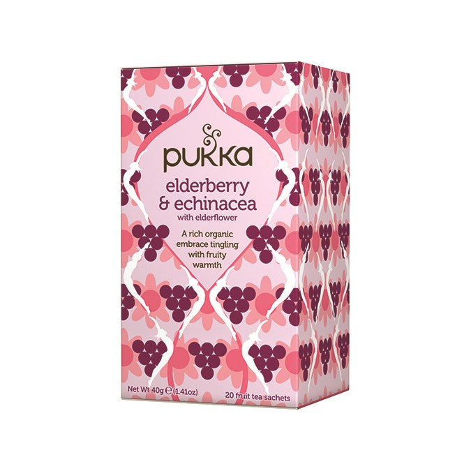 Licorice Root*, Ginger Root*, Echinacea Root and Leaf* (10%), Beetroot*, Aniseed*, Elderflower* (8%), Peppermint Leaf*, Orange Peel*, Elderberry* (6%), Rosehip*, Acerola Juice Flavour*, Orange Essential Oil Flavour*, Natural Blackcurrant Flavour. *Organic Ingredients (99.9%) contains non-organic Lecithin.