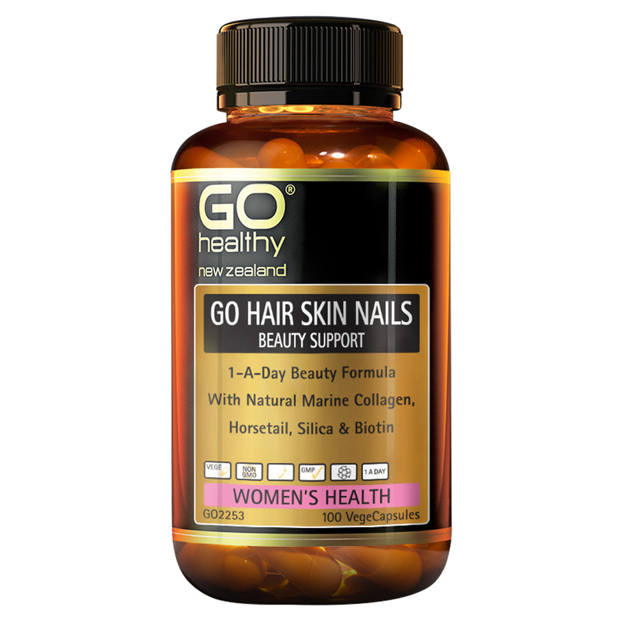 GO HAIR SKIN NAILS BEAUTY SUPPORT contains a specific blend of high strength ingredients designed to support healthy hair, skin and nails. The formulation contains natural marine collagen to help improve skin appearance including fine lines. High potency Silica, Horsetail and Biotin for increased nail thickness and shiny healthy hair. Helps to prevent splitting as well as chipped nails.