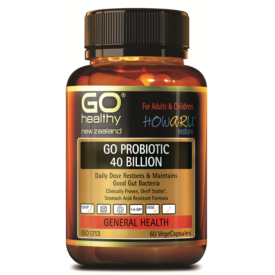 GO PROBIOTIC 40 BILLION is designed to maintain and restore good gut bacteria. Antibiotic medication, the contraceptive pill, alcohol and stress can create an imbalance of good and bad microflora in the intestinal tract which can lead to ill health. Having high levels of good bacteria in the gut is essential for maintaining a healthy immune system and all round good health. GO Probiotic 40 Billion contains HOWARU restore ®, a clinically researched blend of 4 heat stable and stomach acid resistant probiotic strains totalling 40 billion live cells.