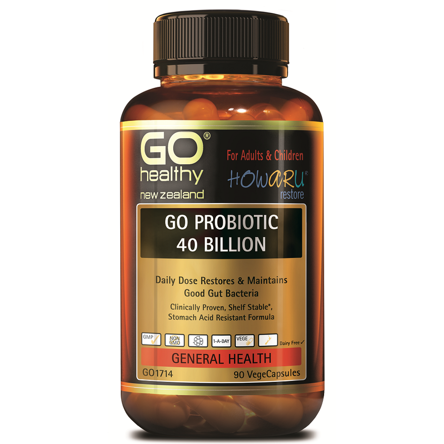 GO PROBIOTIC 40 BILLION is designed to maintain and restore good gut bacteria. Antibiotic medication, the contraceptive pill, alcohol and stress can create an imbalance of good and bad microflora in the intestinal tract which can lead to ill health. Having high levels of good bacteria in the gut is essential for maintaining a healthy immune system and all round good health. GO Probiotic 40 Billion contains HOWARU restore ®, a clinically researched blend of 4 heat stable and stomach acid resistant probiotic strains totalling 40 billion live cells.