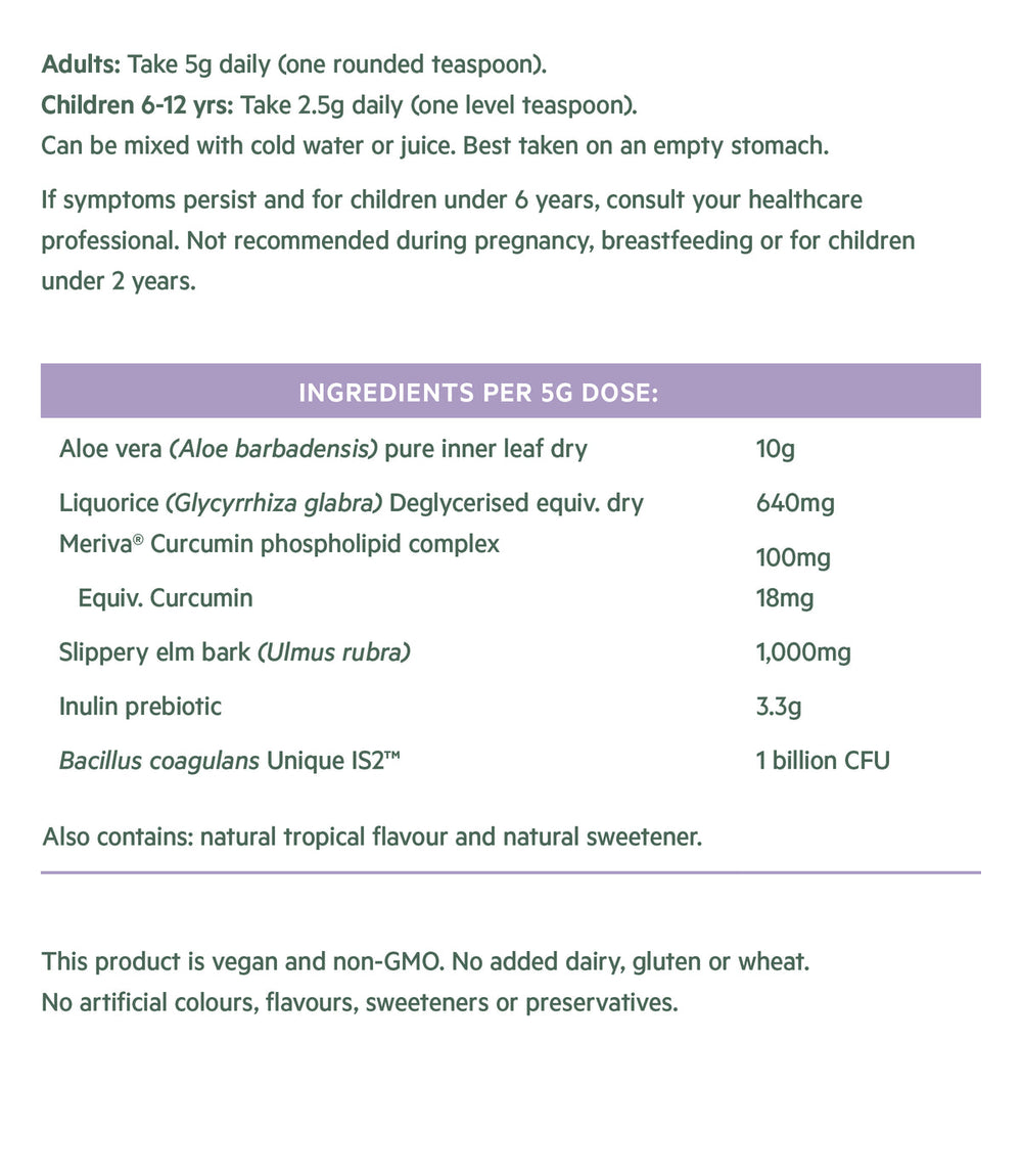With its tropical flavour (100% natural), drinking Gut Soothe with water every day will be a treat for your taste buds as well as your stomach.