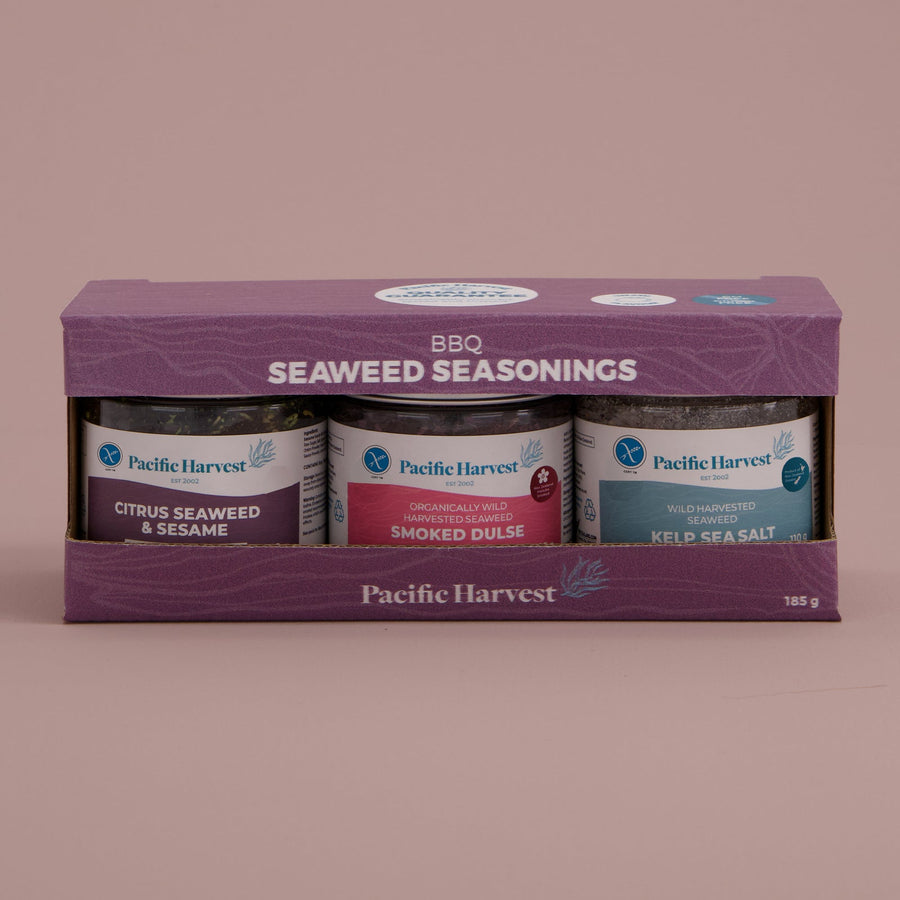 BBQ gift box contains - Smoked Dulse Flakes, Kelp Sea Salt and Citrus Seaweed & Seasame Seasoning. Tenderise meats with kelp salt and add citrus seaweed seasoning to salads, dips and use as a garnish.