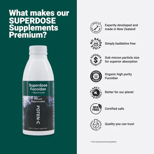 Superdose Fucoidan + Mushroom 750mg is a superior proprietary Fucoidan blend enhanced by renowned Shiitake and Agaricus Blazei Mushroom extracts. Derived from seaweed, Fucoidan provides the algae protection against UV damage and marine-borne pathogens. Extensive research has shown Fucoidan also exhibits powerful health benefits once extracted.