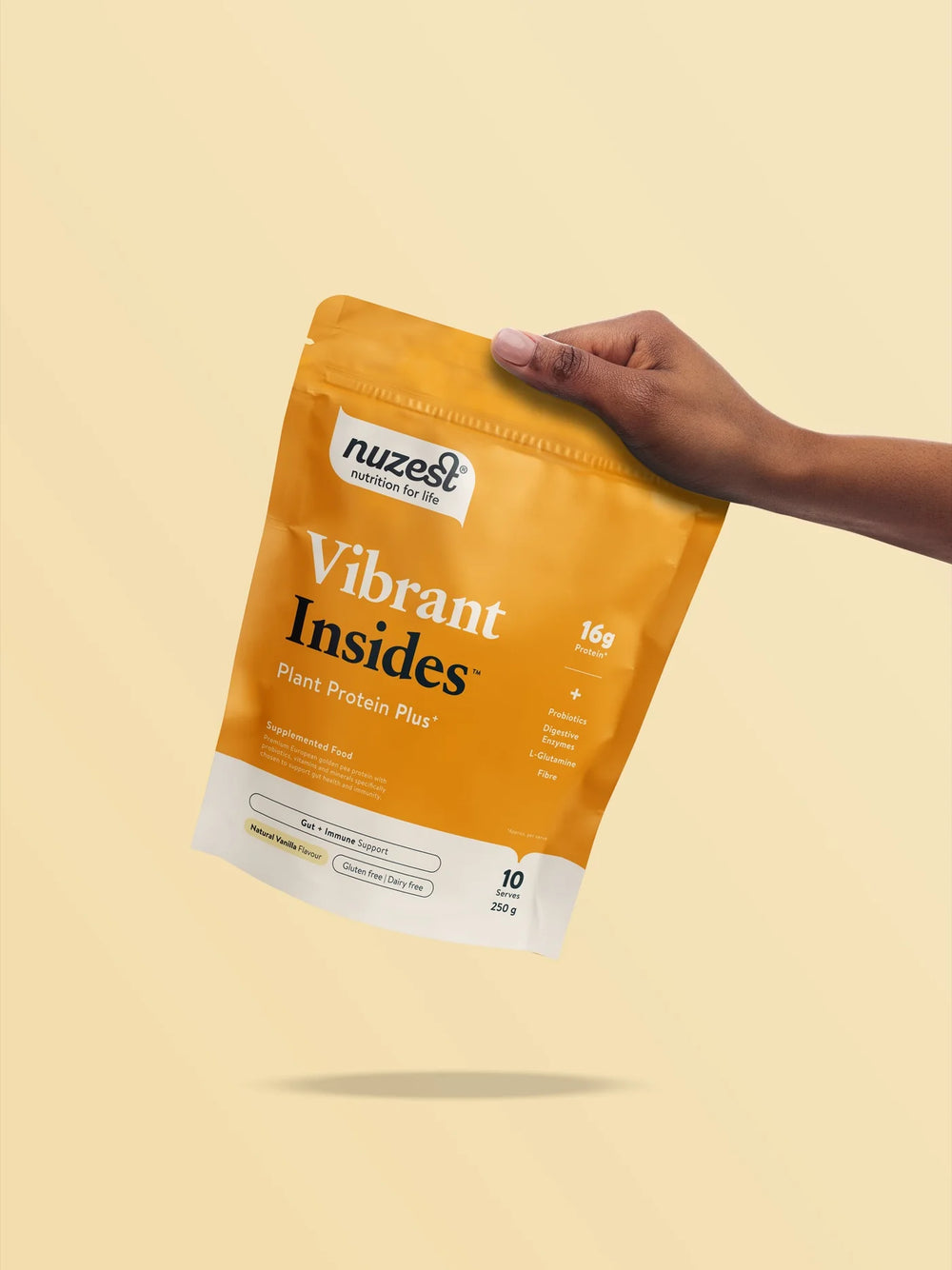 Vibrant Insides - formulated to support the intrinsically linked systems of gut health and immunity. Pure pea protein plus probiotics, enzymes, L-glutamine, Slippery elm and more to help your gut microbiome thrive.