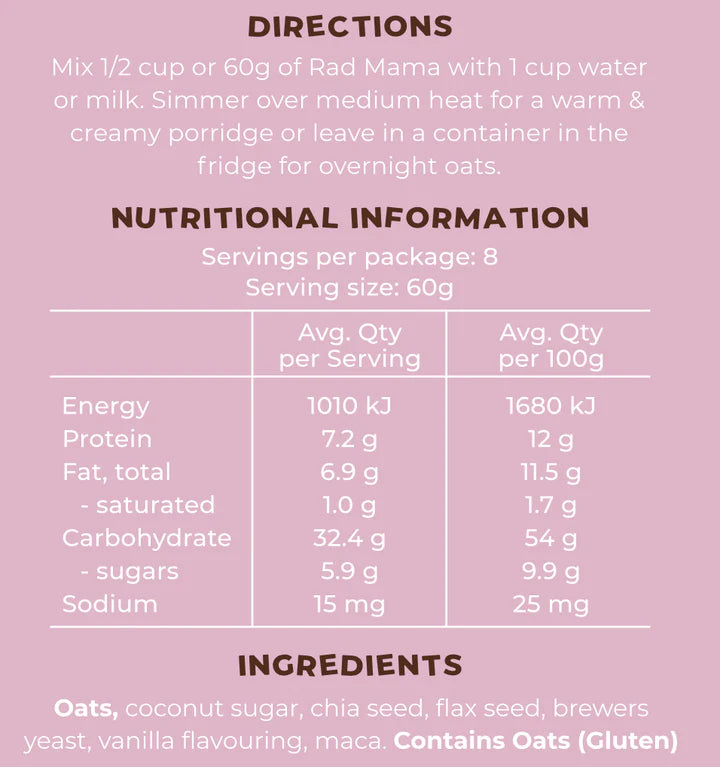 Directions: Mix 1/2 cup or 60g of Rad Mama with 1 cup water or milk. Simmer over medium heat for a warm & creamy porridge or leave in fridge for overnight oats.