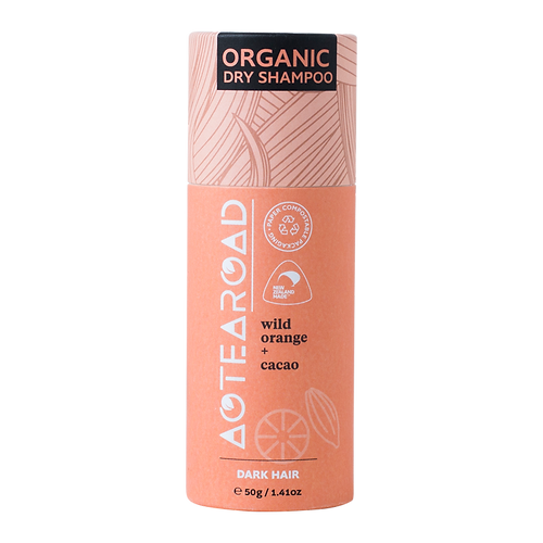 Aotearoad Dry Shampoo for Dark hair colours: Made with Aroha (Love), good for you and good for the planet. With a talc free blend of highly absorbent organic Tapioca, Corn Starch and Bamboo Stem Powder. Aotearoad's dry shampoo strengthens, adds body and softens hair between washes. Clean and style your hair on the go, refreshing post workout or second-day locks to their former glory in seconds, scented with Wild Orange and Cacao. In compostable paper packaging