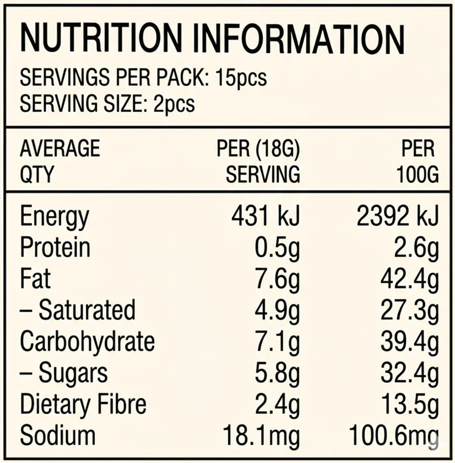 Filling (maple sugar (11.3%), inulin, cocoa butter, coconut oil, hazelnut (5%), tigernut flour (2.3%), sea salt (fleur de sel) (0.3%), soy lecithin, vanilla bean), chocolate (cocoa mass, maple sugar (16.8%), cocoa butter, tigernut flour (5%), soy lecithin). [Cacao solids 55%]. Contains: Hazelnut, Soy May be present: Almond, Milk