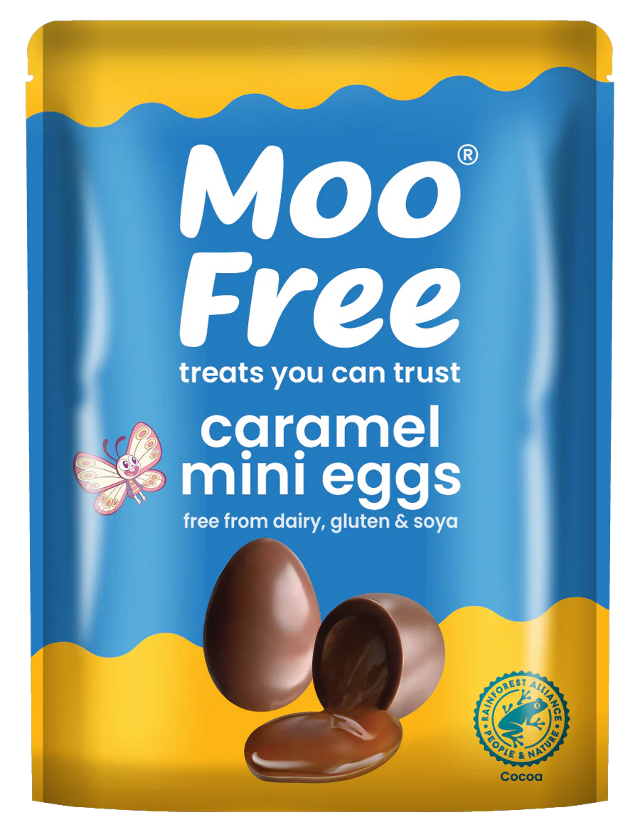 Say hello to Moo Free's caramel filled mini eggs! Savour the creamy decadence of Moo Free's dairy-free milk chocolate mini eggs, each bursting with luscious, runny free-from caramel.
