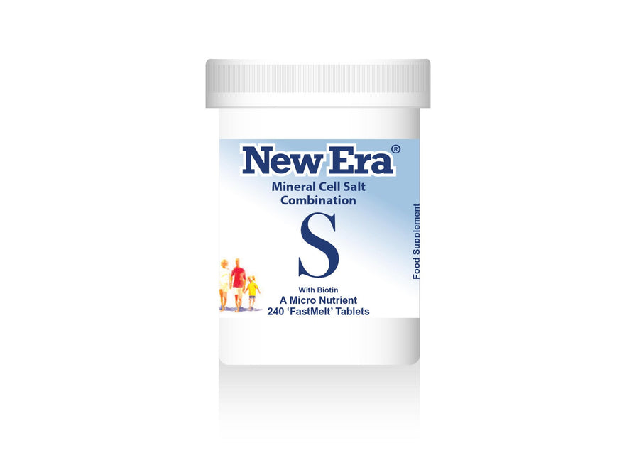 New Era Mineral Cell Salt Combination S contains Potassium Chloride, Sodium Phosphate, Sodium Sulphate. Kali. Mur., Nat. Phos., Nat. Sulph. 12 tablets provide +15ug of Biotin (30% Reference Intake).These may safely be taken alongside other supplements or medicines.