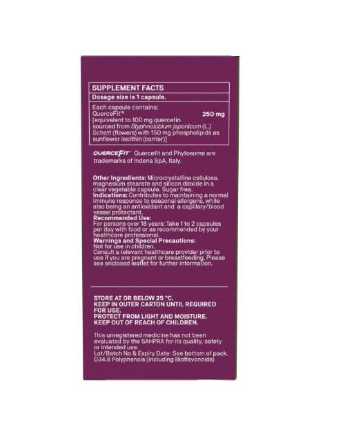 QuerceFit 250mg (equivalent to 100mg quercetin sourced from Styphnolobium japonium (L.) Schott (Flowers) with 150mg phospholipids as sunflower lecithin as a carrier)